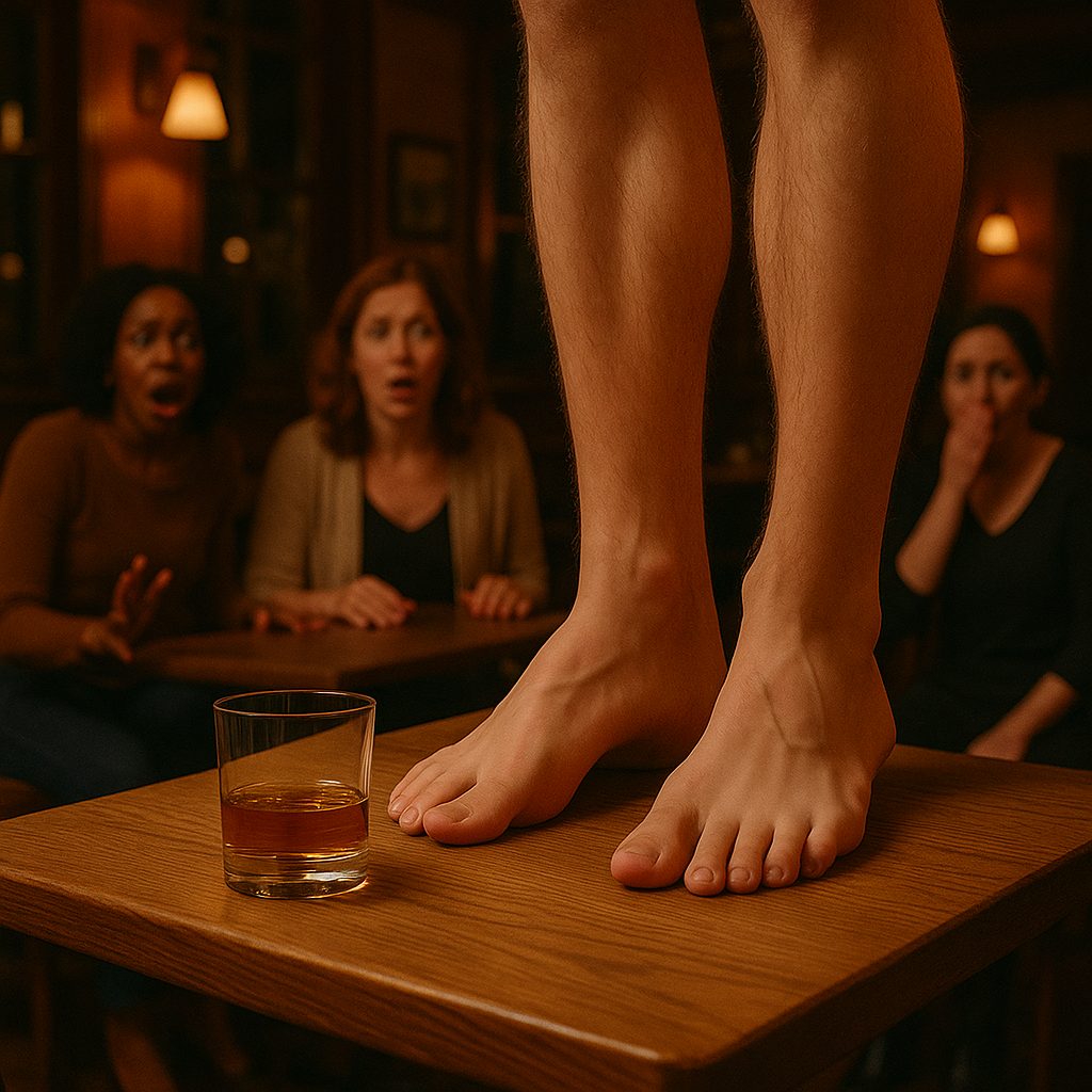 ‘Henk! Henk!’ riep ze tegen haar echtgenoot. ‘Daar staat die kerel van toen! Het is niet te geloven! De man die zonder kleren op een tafel sprong toen we onze culturele avond hadden! Red me Henk! Haal me hier weg! De duivel is terug!’